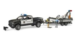 Polícia BRUDER prijíma posily a rozširuje oblasť svojich operácií o vodu. Aby bolo možné v budúcnosti fungovať na akomkoľvek type vody, pribudne k pohotovostným službám BRUDER policajný pick-up 4×4 s člnom a záchranárskymi potápačmi. Zásahové vozidlo BRUDER je založené na známej RAM 2500 a má na streche namontovaný svetelný a zvukový modul. Rovnako ako jej veľký vzor je hračka vybavená štvordverovou kabínou CREW Cab. Všetky dvere je možné otvoriť a ponúkajú priestor pre 4 figúrky bworld. Pre jazdný komfort a mobilitu v teréne je tento model v mierke 1:16 vybavený odpruženými nápravami, pričom prednú nápravu je možné riadiť pomocou priloženého volantu. Dvere batožinového priestoru je možné otvoriť. Policajný čln s ovládacou konzolou je dôležitým pomocníkom pri každodennej policajnej práci vďaka svojej ovládateľnosti a všestrannosti a ponúka priestor až pre 3 figúrky bworld. Policajný čln BRUDER je samozrejme plávajúci a vybavený všestranným svetlom, aby si deti mohli operácie zopakovať čo najbližšie k realite. Dve figúrky bworld sú súčasťou balenia. Zatiaľ čo policajtka je poverená riadením policajného vozidla a člna, plne vybavený policajný potápač sa stará o operácie vo vode.